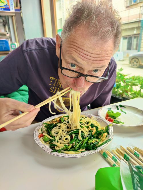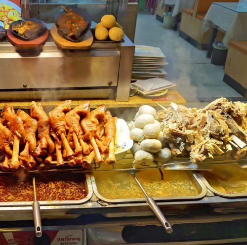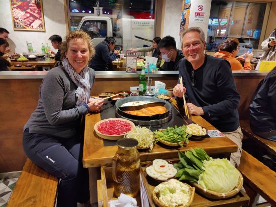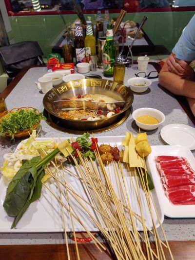 Abends haben wir uns oft für „Hotpot“ entschlossen. Eine Hühnerbrühe, die dicke alternative Chilibrühe haben wir dankend abgelehnt, wird heiß in die Tischmitte gestellt und von unten geheizt. Ähnlich einem Fondue. Die Zutaten werden entweder nach Anzahl der Holzspieße abgerechnet, pauschal bezahlt oder die jeweiligen bestellten Platten beglichen. Wenn es nur Platten zu bestellen galt, ist Anke durchs Restaurant gelaufen, die Bedienung hinterher und Anke hat mit dem Finger auf den umliegenden Tischen gedeutet, was wir essen möchten. Wenn es Spieße zum Aussuchen gab, war es einfach. Dort haben wir in den Vitrinen gesehen, was es alles für den „Hotpot“ gibt. Das offensichtliche wie Pilze und Gemüse, diverse erkennbare Stücke vom Rind, Huhn, Lamm, Schwein. Aber auch faustgroßes Hirn, Innereien und die überall populären Hühnerfüße.